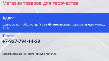 Магазин товаров для творчества по адресу Самарская область, Усть-Кинельский, Спортивная улица, 11а в дальнейшем Организация, размещена в следующих категориях: