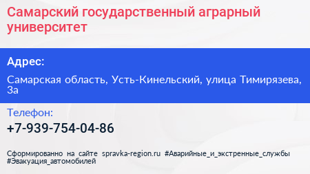 Самарский государственный аграрный университет по адресу Самарская область, Усть-Кинельский, улица Тимирязева, 3а в дальнейшем Организация, размещена в следующих категориях:
