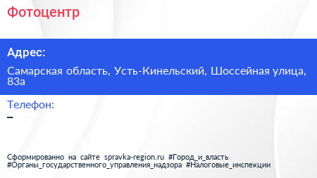 Фотоцентр по адресу Самарская область, Усть-Кинельский, Шоссейная улица, 83а в дальнейшем Организация, размещена в следующих категориях: