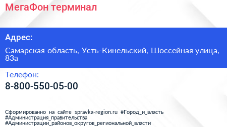 МегаФон, терминал по адресу Самарская область, Усть-Кинельский, Шоссейная улица, 83а в дальнейшем Организация, размещена в следующих категориях:
