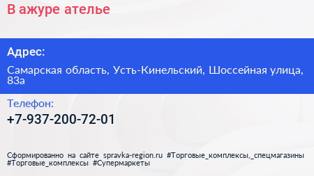 В ажуре, ателье по адресу Самарская область, Усть-Кинельский, Шоссейная улица, 83а в дальнейшем Организация, размещена в следующих категориях: