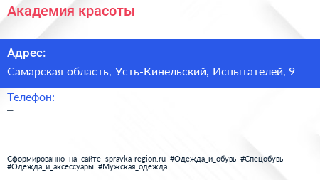 Академия красоты по адресу Самарская область, Усть-Кинельский, Испытателей, 9 в дальнейшем Организация, размещена в следующих категориях: