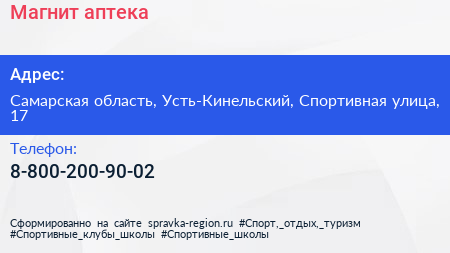 Магнит, аптека по адресу Самарская область, Усть-Кинельский, Спортивная улица, 17 в дальнейшем Организация, размещена в следующих категориях: