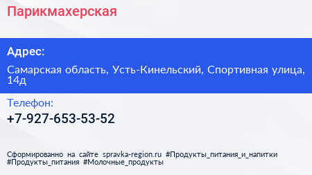Парикмахерская по адресу Самарская область, Усть-Кинельский, Спортивная улица, 14д в дальнейшем Организация, размещена в следующих категориях: