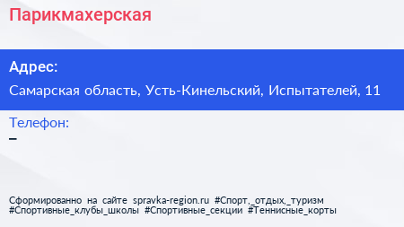 Парикмахерская по адресу Самарская область, Усть-Кинельский, Испытателей, 11 в дальнейшем Организация, размещена в следующих категориях: