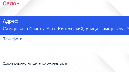 Салон по адресу Самарская область, Усть-Кинельский, улица Тимирязева, 2 в дальнейшем Организация, размещена в следующих категориях: