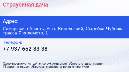 Страусиная дача по адресу Самарская область, Усть-Кинельский, Сырейка-Чубовка трасса 7 километр, 1 в дальнейшем Организация, размещена в следующих категориях: