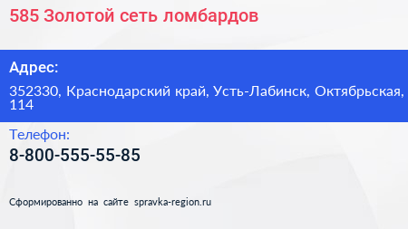 585*Золотой, сеть ломбардов по адресу 352330, Краснодарский край, Усть-Лабинск, Октябрьская, 114 в дальнейшем Организация, размещена в следующих категориях:
