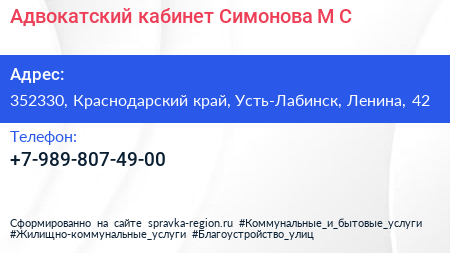 Адвокатский кабинет Симонова М.С. по адресу 352330, Краснодарский край, Усть-Лабинск, Ленина, 42 в дальнейшем Организация, размещена в следующих категориях: