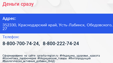 Деньги сразу по адресу 352330, Краснодарский край, Усть-Лабинск, Ободовского, 27 в дальнейшем Организация, размещена в следующих категориях: