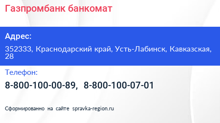 Газпромбанк, банкомат по адресу 352333, Краснодарский край, Усть-Лабинск, Кавказская, 28 в дальнейшем Организация, размещена в следующих категориях: