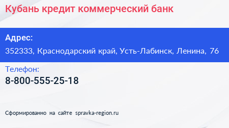 Кубань кредит, коммерческий банк по адресу 352333, Краснодарский край, Усть-Лабинск, Ленина, 76 в дальнейшем Организация, размещена в следующих категориях: