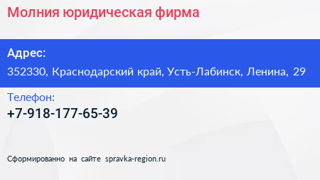 Молния, юридическая фирма по адресу 352330, Краснодарский край, Усть-Лабинск, Ленина, 29 в дальнейшем Организация, размещена в следующих категориях: