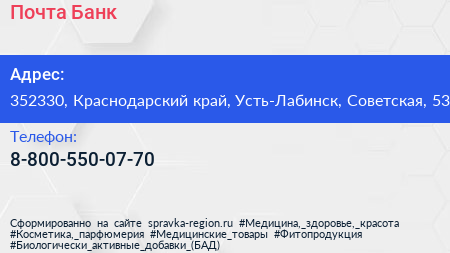 Почта Банк по адресу 352330, Краснодарский край, Усть-Лабинск, Советская, 53 в дальнейшем Организация, размещена в следующих категориях: