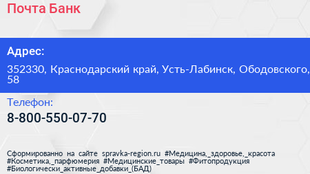 Почта Банк по адресу 352330, Краснодарский край, Усть-Лабинск, Ободовского, 58 в дальнейшем Организация, размещена в следующих категориях: