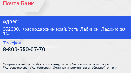 Почта Банк по адресу 352330, Краснодарский край, Усть-Лабинск, Ладожская, 165 в дальнейшем Организация, размещена в следующих категориях:
