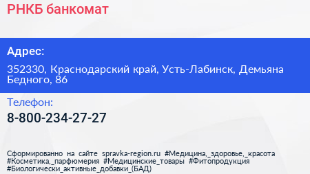 РНКБ, банкомат по адресу 352330, Краснодарский край, Усть-Лабинск, Демьяна Бедного, 86 в дальнейшем Организация, размещена в следующих категориях:
