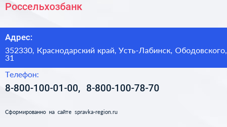 Россельхозбанк по адресу 352330, Краснодарский край, Усть-Лабинск, Ободовского, 31 в дальнейшем Организация, размещена в следующих категориях: