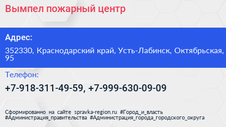 Вымпел, пожарный центр по адресу 352330, Краснодарский край, Усть-Лабинск, Октябрьская, 95 в дальнейшем Организация, размещена в следующих категориях: