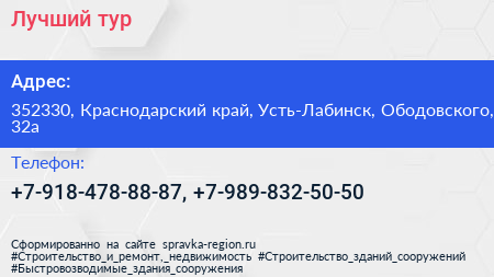 Лучший тур по адресу 352330, Краснодарский край, Усть-Лабинск, Ободовского, 32а в дальнейшем Организация, размещена в следующих категориях: