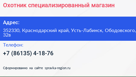 Охотник, специализированный магазин по адресу 352330, Краснодарский край, Усть-Лабинск, Ободовского, 32в в дальнейшем Организация, размещена в следующих категориях: