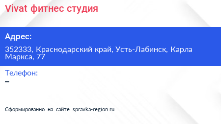 Vivat, фитнес-студия по адресу 352333, Краснодарский край, Усть-Лабинск, Карла Маркса, 77 в дальнейшем Организация, размещена в следующих категориях: