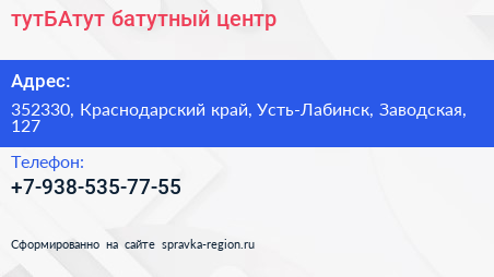 тутБАтут, батутный центр по адресу 352330, Краснодарский край, Усть-Лабинск, Заводская, 127 в дальнейшем Организация, размещена в следующих категориях: