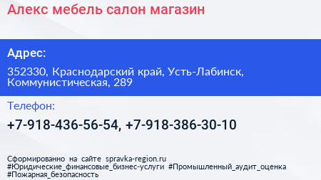 Алекс мебель, салон-магазин по адресу 352330, Краснодарский край, Усть-Лабинск, Коммунистическая, 289 в дальнейшем Организация, размещена в следующих категориях: