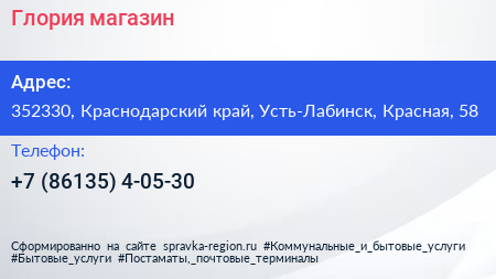 Глория, магазин по адресу 352330, Краснодарский край, Усть-Лабинск, Красная, 58 в дальнейшем Организация, размещена в следующих категориях: