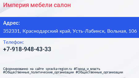 Империя мебели, салон по адресу 352331, Краснодарский край, Усть-Лабинск, Вольная, 106 в дальнейшем Организация, размещена в следующих категориях: