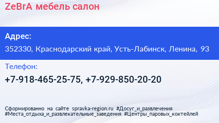ZeBrA-мебель, салон по адресу 352330, Краснодарский край, Усть-Лабинск, Ленина, 93 в дальнейшем Организация, размещена в следующих категориях: