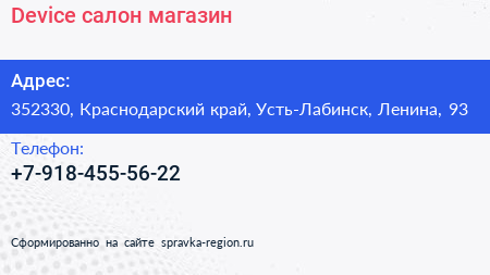 Device, салон-магазин по адресу 352330, Краснодарский край, Усть-Лабинск, Ленина, 93 в дальнейшем Организация, размещена в следующих категориях: