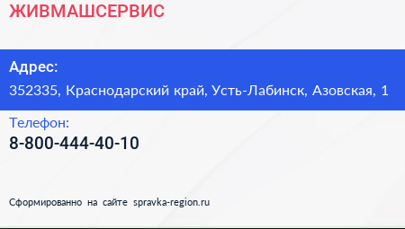 ЖИВМАШСЕРВИС по адресу 352335, Краснодарский край, Усть-Лабинск, Азовская, 1 в дальнейшем Организация, размещена в следующих категориях: