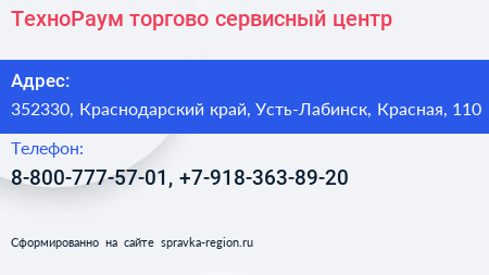 ТехноРаум, торгово-сервисный центр по адресу 352330, Краснодарский край, Усть-Лабинск, Красная, 110 в дальнейшем Организация, размещена в следующих категориях: