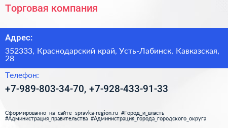 Торговая компания по адресу 352333, Краснодарский край, Усть-Лабинск, Кавказская, 28 в дальнейшем Организация, размещена в следующих категориях:
