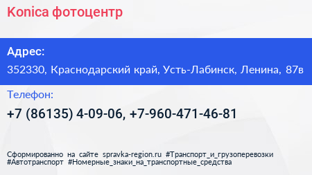 Konica, фотоцентр по адресу 352330, Краснодарский край, Усть-Лабинск, Ленина, 87в в дальнейшем Организация, размещена в следующих категориях: