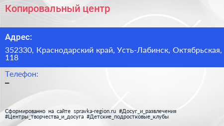 Копировальный центр по адресу 352330, Краснодарский край, Усть-Лабинск, Октябрьская, 118 в дальнейшем Организация, размещена в следующих категориях: