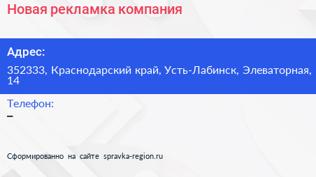 Новая рекламка, компания по адресу 352333, Краснодарский край, Усть-Лабинск, Элеваторная, 14 в дальнейшем Организация, размещена в следующих категориях: