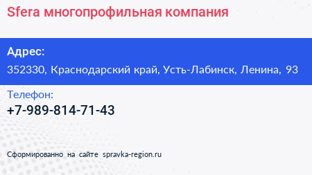 Sfera, многопрофильная компания по адресу 352330, Краснодарский край, Усть-Лабинск, Ленина, 93 в дальнейшем Организация, размещена в следующих категориях: