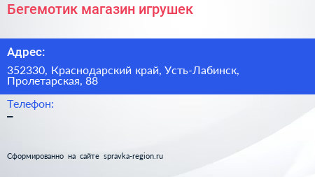 Бегемотик, магазин игрушек по адресу 352330, Краснодарский край, Усть-Лабинск, Пролетарская, 88 в дальнейшем Организация, размещена в следующих категориях: