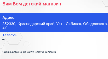 Бим Бом, детский магазин по адресу 352330, Краснодарский край, Усть-Лабинск, Ободовского, 27 в дальнейшем Организация, размещена в следующих категориях: