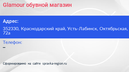 Glamour, обувной магазин по адресу 352330, Краснодарский край, Усть-Лабинск, Октябрьская, 72а в дальнейшем Организация, размещена в следующих категориях: