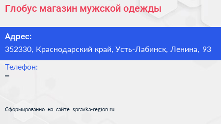 Глобус, магазин мужской одежды по адресу 352330, Краснодарский край, Усть-Лабинск, Ленина, 93 в дальнейшем Организация, размещена в следующих категориях: