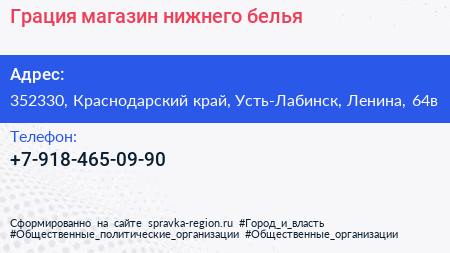 Грация, магазин нижнего белья по адресу 352330, Краснодарский край, Усть-Лабинск, Ленина, 64в в дальнейшем Организация, размещена в следующих категориях: