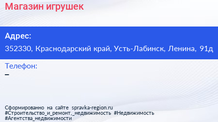 Магазин игрушек по адресу 352330, Краснодарский край, Усть-Лабинск, Ленина, 91д в дальнейшем Организация, размещена в следующих категориях: