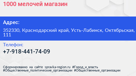 1000 мелочей, магазин по адресу 352330, Краснодарский край, Усть-Лабинск, Октябрьская, 111 в дальнейшем Организация, размещена в следующих категориях: