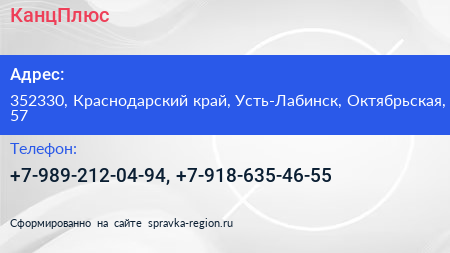 КанцПлюс по адресу 352330, Краснодарский край, Усть-Лабинск, Октябрьская, 57 в дальнейшем Организация, размещена в следующих категориях: