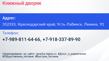 Книжный дворик по адресу 352333, Краснодарский край, Усть-Лабинск, Ленина, 91 в дальнейшем Организация, размещена в следующих категориях: