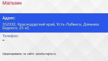 Магазин по адресу 352332, Краснодарский край, Усть-Лабинск, Демьяна Бедного, 25 к1 в дальнейшем Организация, размещена в следующих категориях: