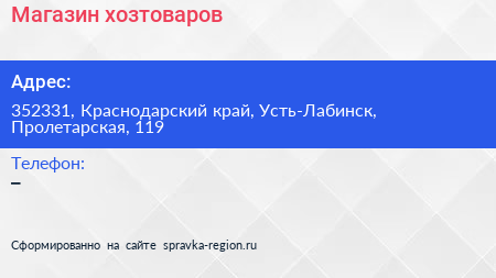 Магазин хозтоваров по адресу 352331, Краснодарский край, Усть-Лабинск, Пролетарская, 119 в дальнейшем Организация, размещена в следующих категориях: